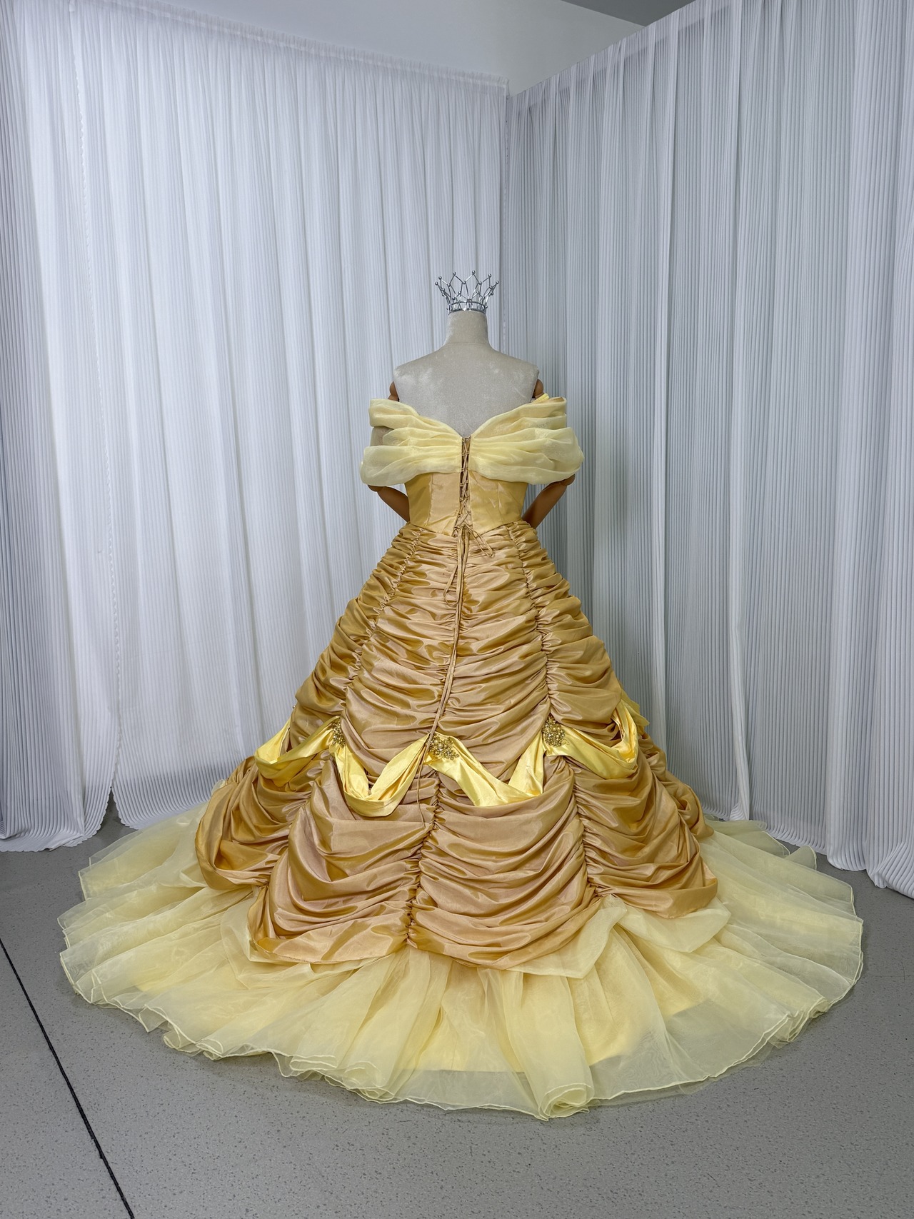 カラードレス 黄色い オフショルダー ビジュービーズ 編み上げ ラッフルフリル 華やかなトレーン