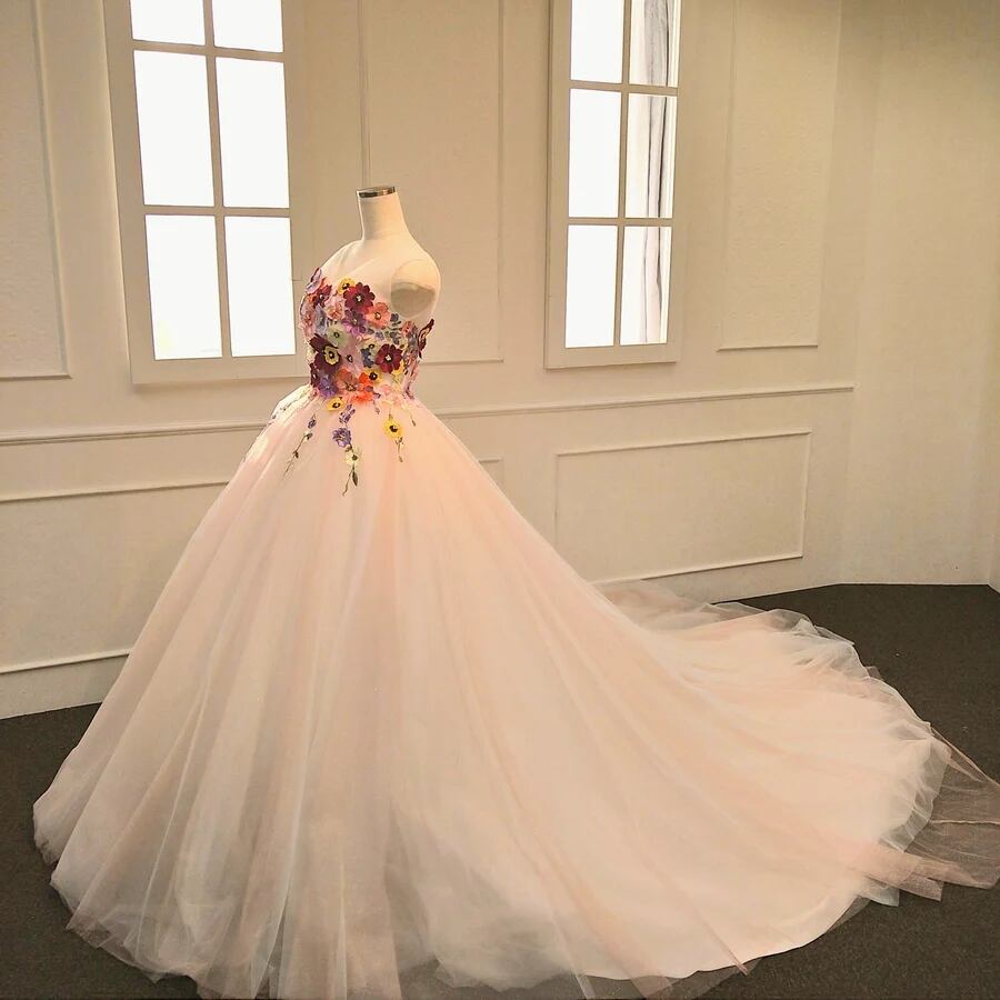 ウエディングドレス オフホワイト 3D立体レース刺繍 オンショルダードレス 憧れのドレス 柔らかく重ねたチュールスカート 結婚式 華やかなトレーン