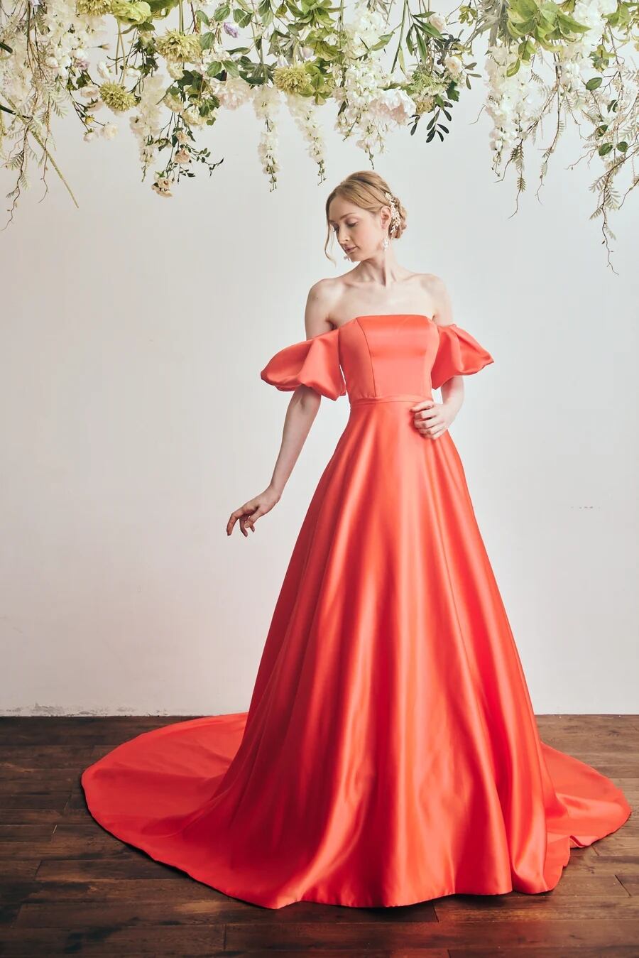 カラードレス オレンジ オフショルダー ビスチェタイプ 上品! 演奏会/音楽会 光沢サテン 華やかなトレーン