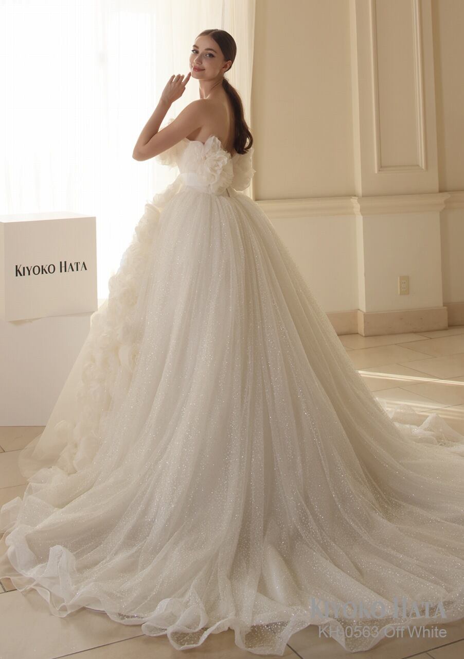 ウエディングドレス オフホワイト ベアトップ キラキラグリッターチュール サッシュベルト 上品! 結婚式 柔らかく重ねたチュールスカート