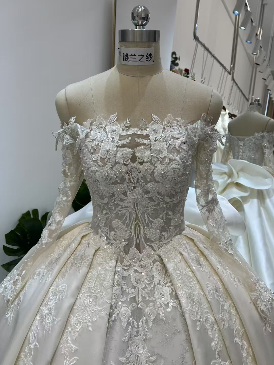 ウエディングドレス ホワイト オフショルダー ロングスリーブ 細見えシルエット エレガントレース 豪華! ロングトレーン 憧れのドレス