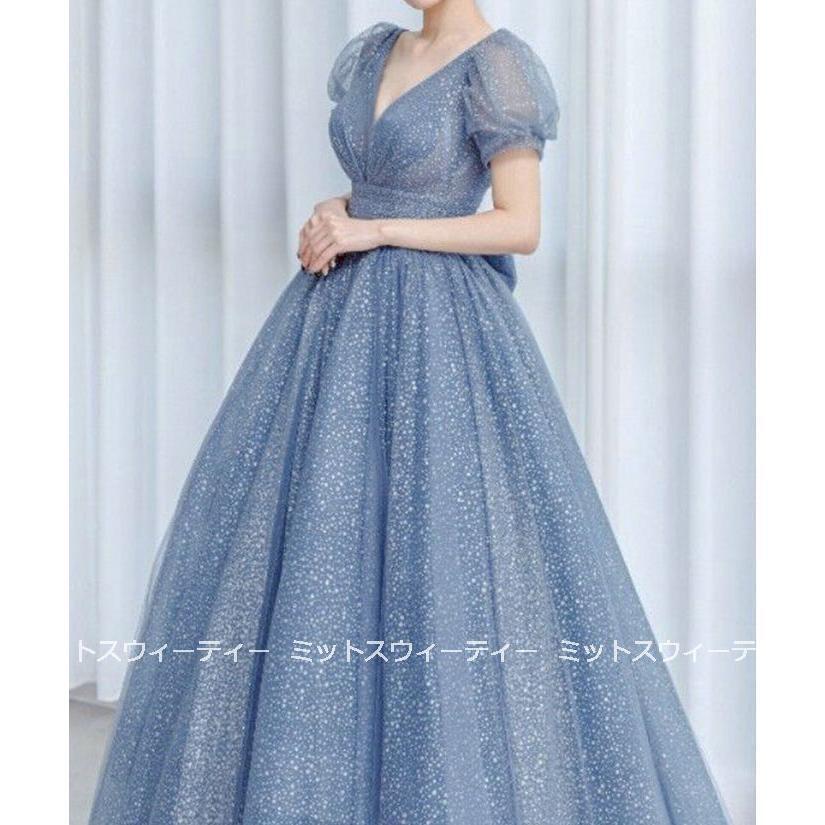 カラードレス 演奏会 発表会 ピアノ バイオリン ロングドレス Aライン プリンセス パフスリーブ パーティードレス 青 誕生日 イブニングドレス 二次会 結婚式