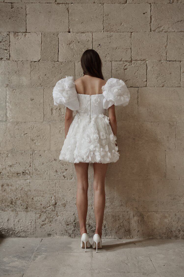 ウエディングドレス ホワイト 結婚式/披露宴 パフスリーブ ファスナー 花モチーフ スレンダーライン