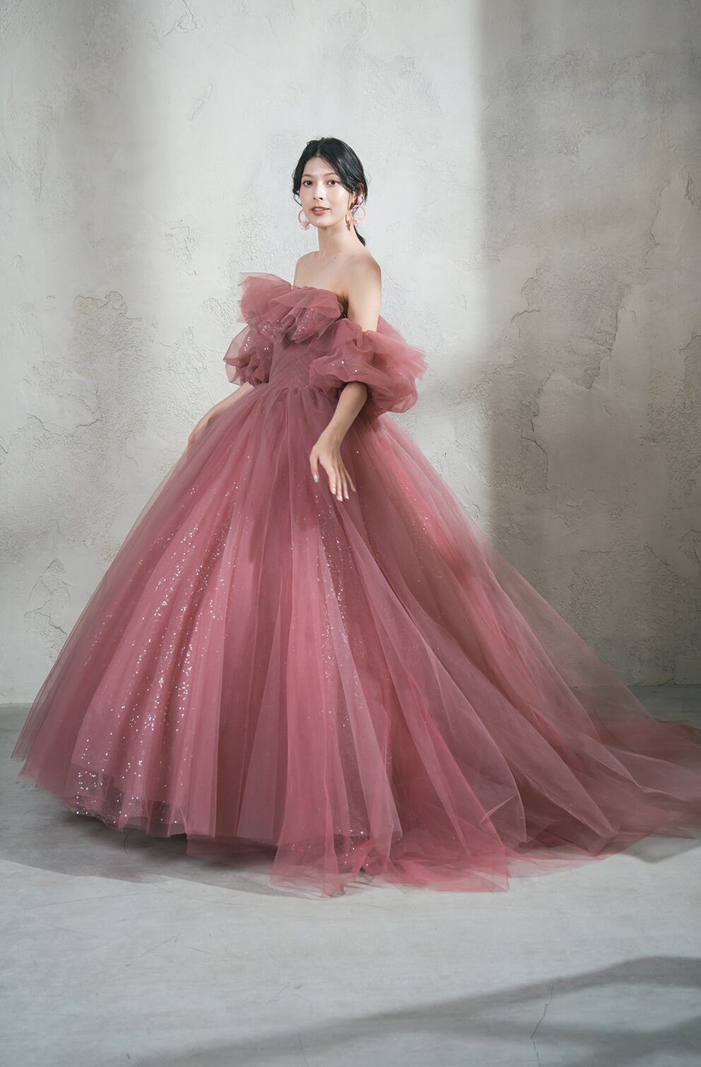 カラードレス ピンク オフショルダー 花嫁 柔らかく重ねたチュールスカート キラキラグリッターチュール ふわふわ袖 ミニトレーン