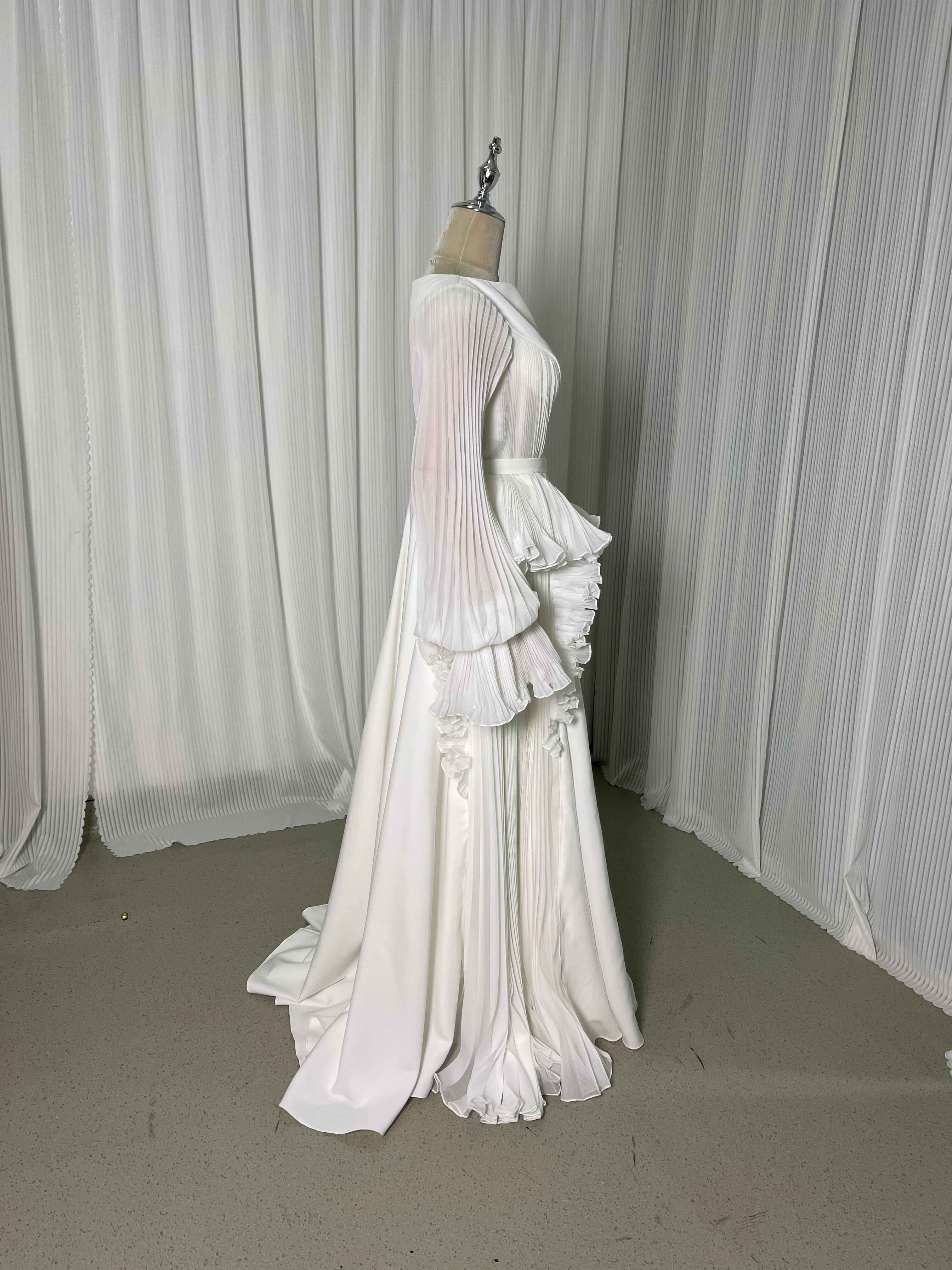 ウエディングドレス ホワイト クルーネック ファスナー ロングスリーブ フリル袖 ピアノ演奏会/音楽会/発表会など フリルドレス