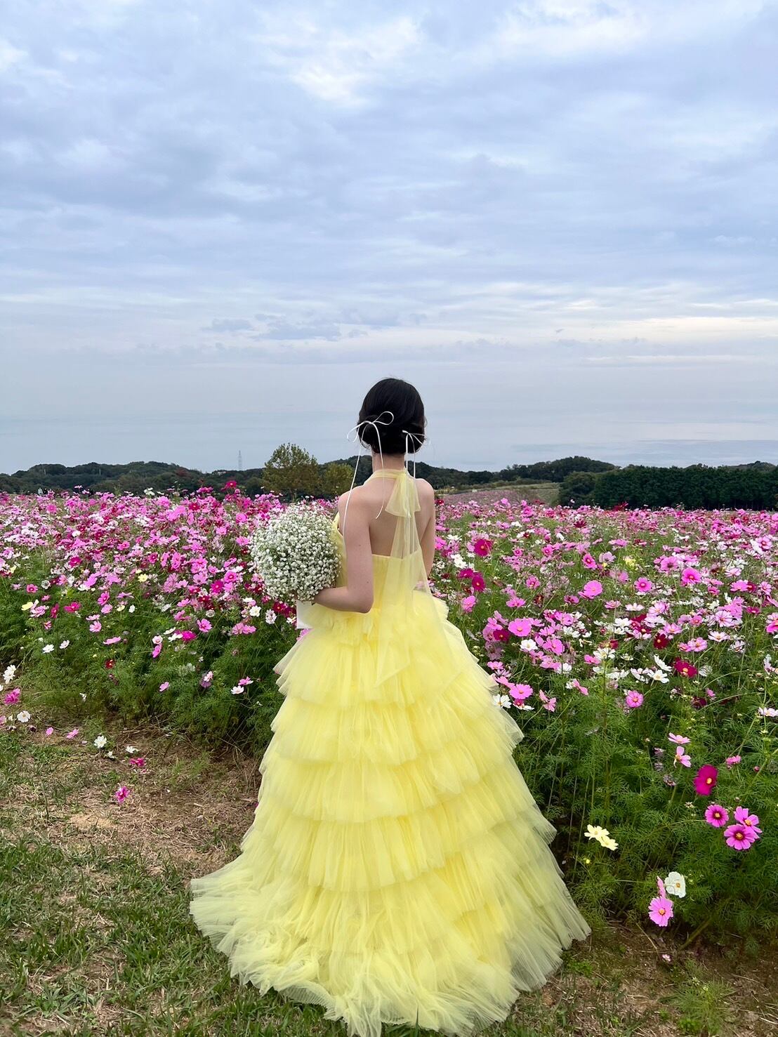 実例写真! ウエディングドレス イエロー ホルターネック プリンセスライン 花嫁 ロング レイヤードドレス
