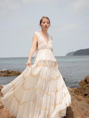 カラードレス 薄シャンパンの色 オンショルダードレス Vネック 揺らめく裾 エレガント クラシカル ミニトレーン レイヤードドレス