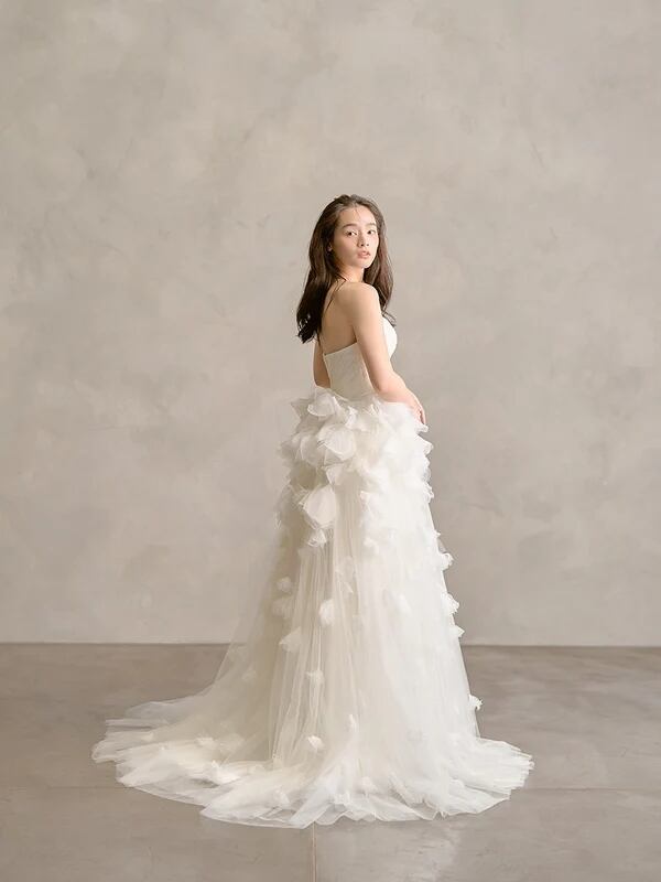 ウエディングドレス オフホワイト ベアトップ ソフトチュール 花モチーフ 結婚式/披露宴 ミニトレーン 豪華! チュールドレス