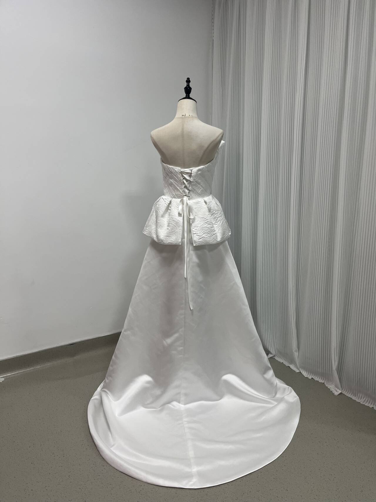 ウエディングドレス ホワイト ベアトップ ビスチェタイプ 光沢サテン 結婚式/披露宴 ミニトレーン スリット レイヤードドレス