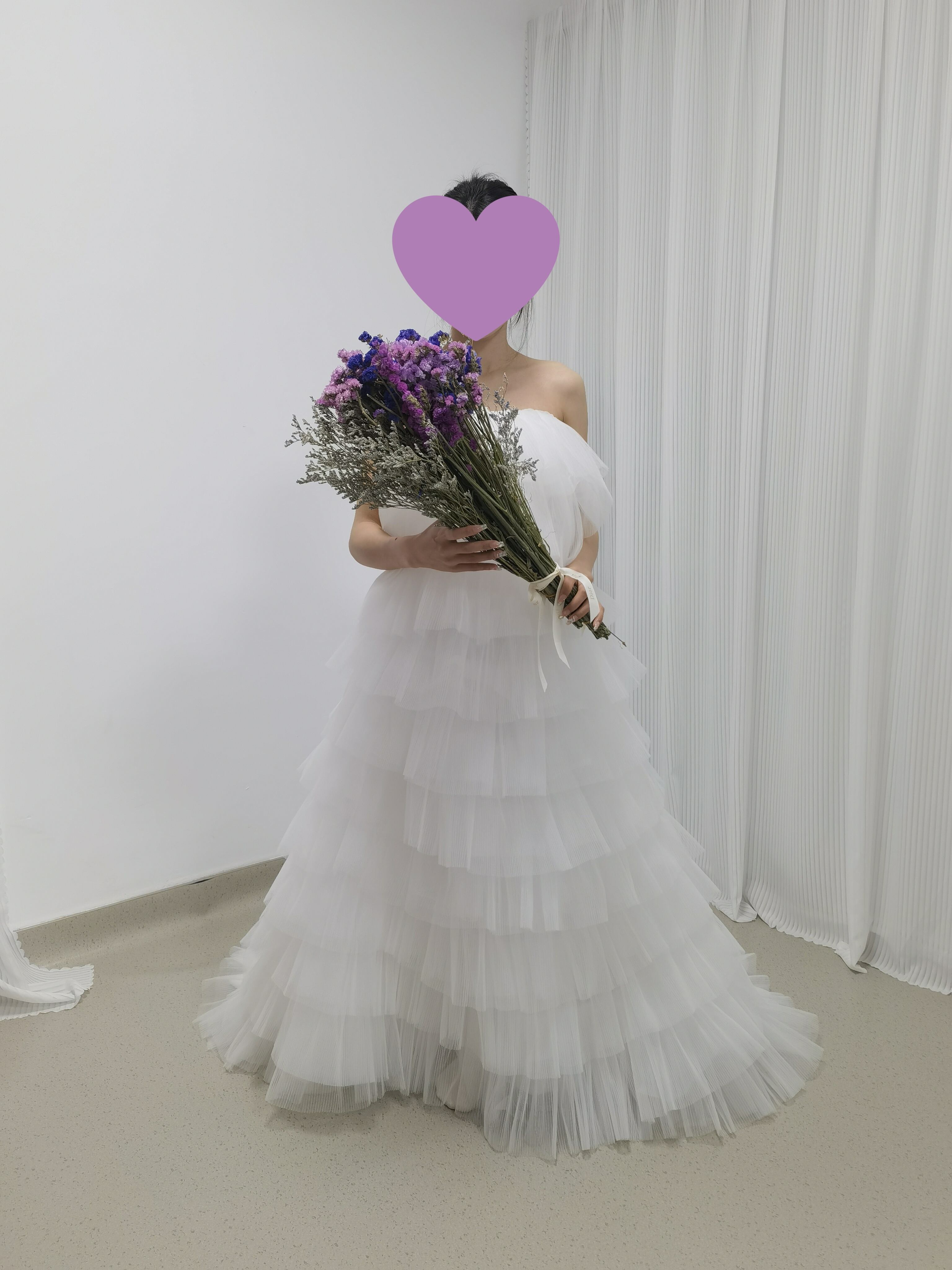 ウエディングドレス ホワイト ベアトップ ミニトレーン ソフトチュール 結婚式/披露宴 レイヤードドレス