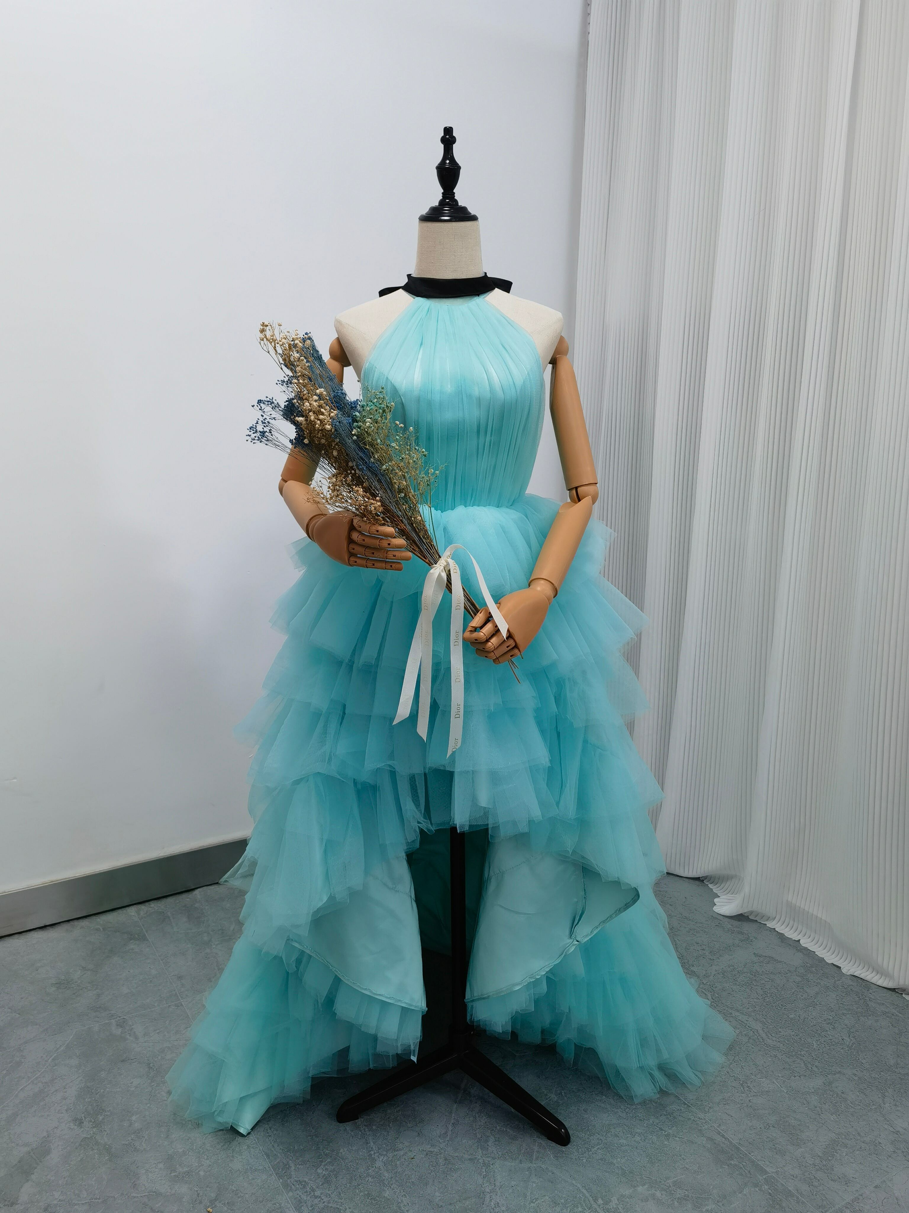 カラードレス ホルターネック 爽やかで優しいブルー ピアノ演奏会/音楽会/発表会など エレガント フィッシュテール ソフトチュール レイヤードドレス
