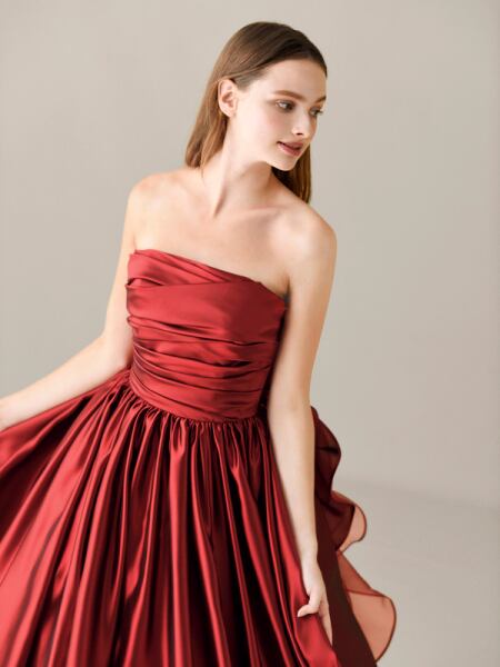 カラードレス ワインレッド ベアトップ スリット 華やかなトレーン エレガント 花嫁 編み上げ 光沢サテン