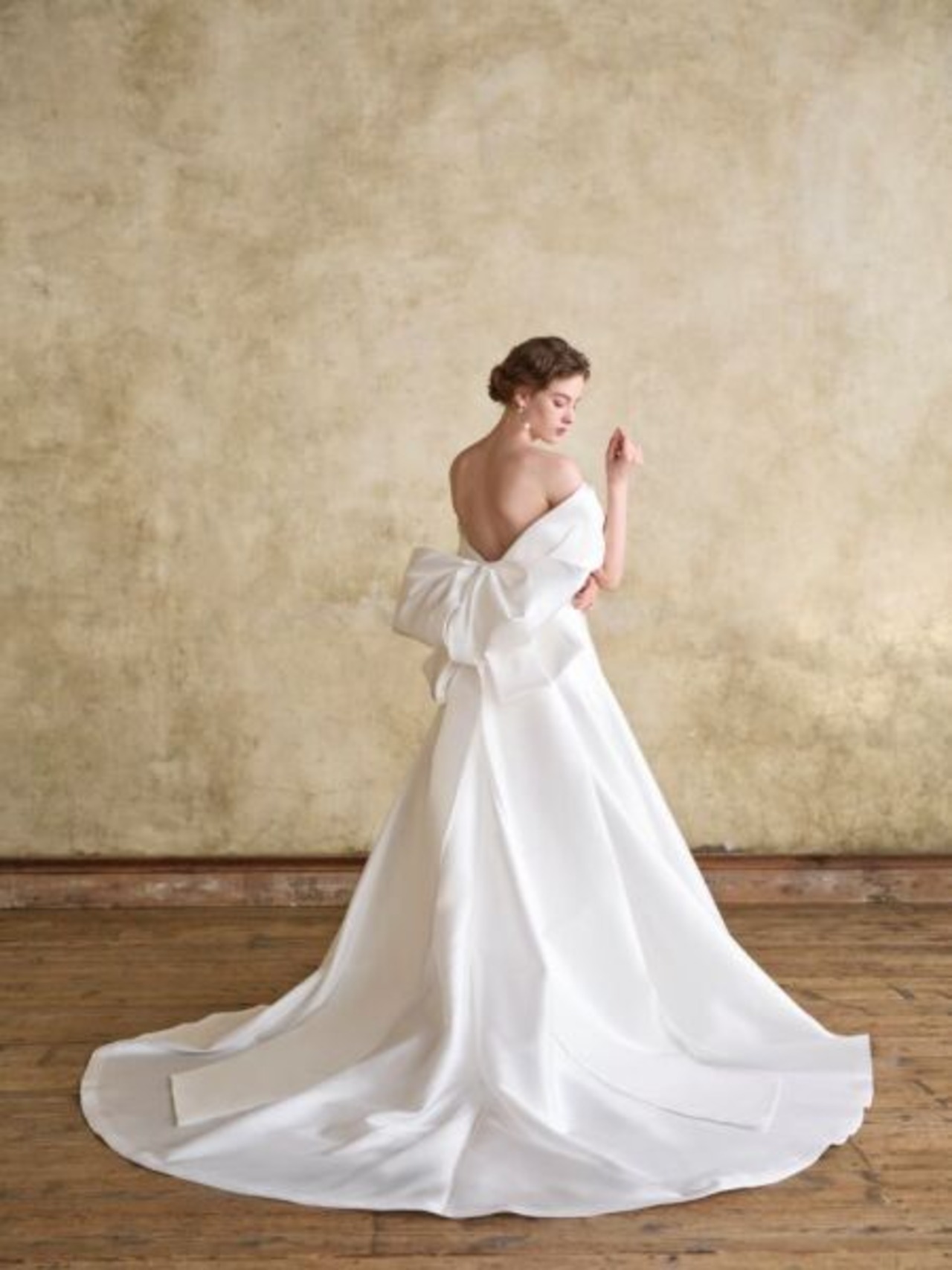 ウエディングドレス ホワイト 取り外しオフショルダー 光沢サテン ふっくら柔らかなバックリボン 結婚式/披露宴 華やかなトレーン
