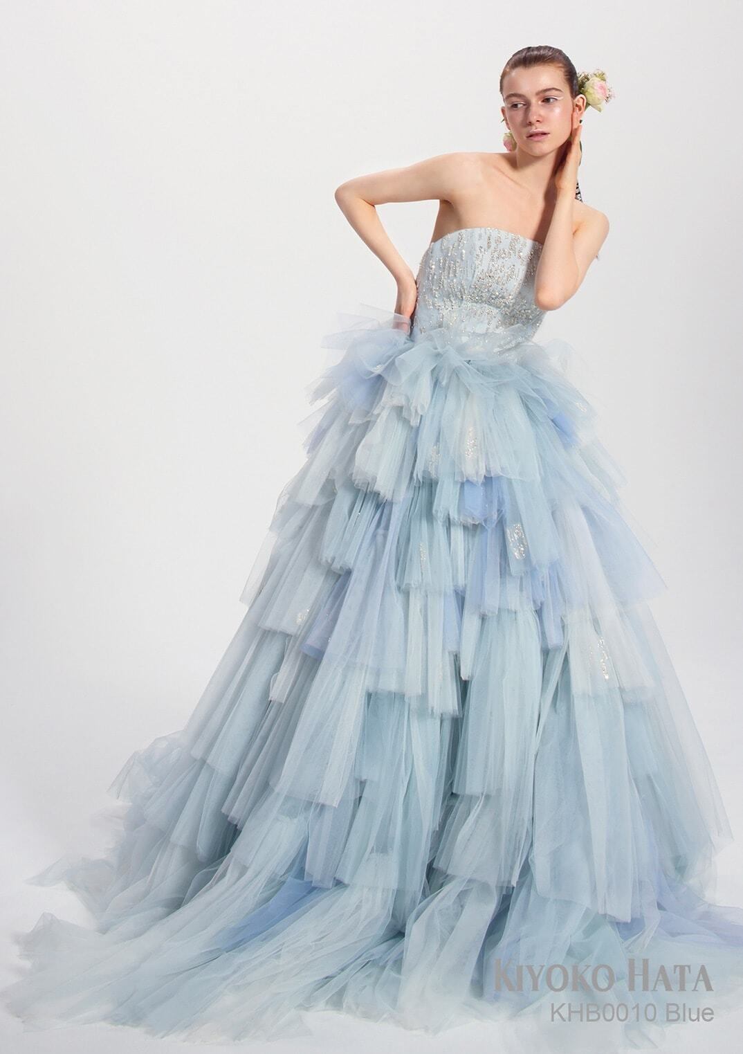 カラードレス 爽やかで優しいブルー 取り外し袖 取り外しオフショルダー ミディアムドレス ソフトチュール 花嫁 レイヤードドレス