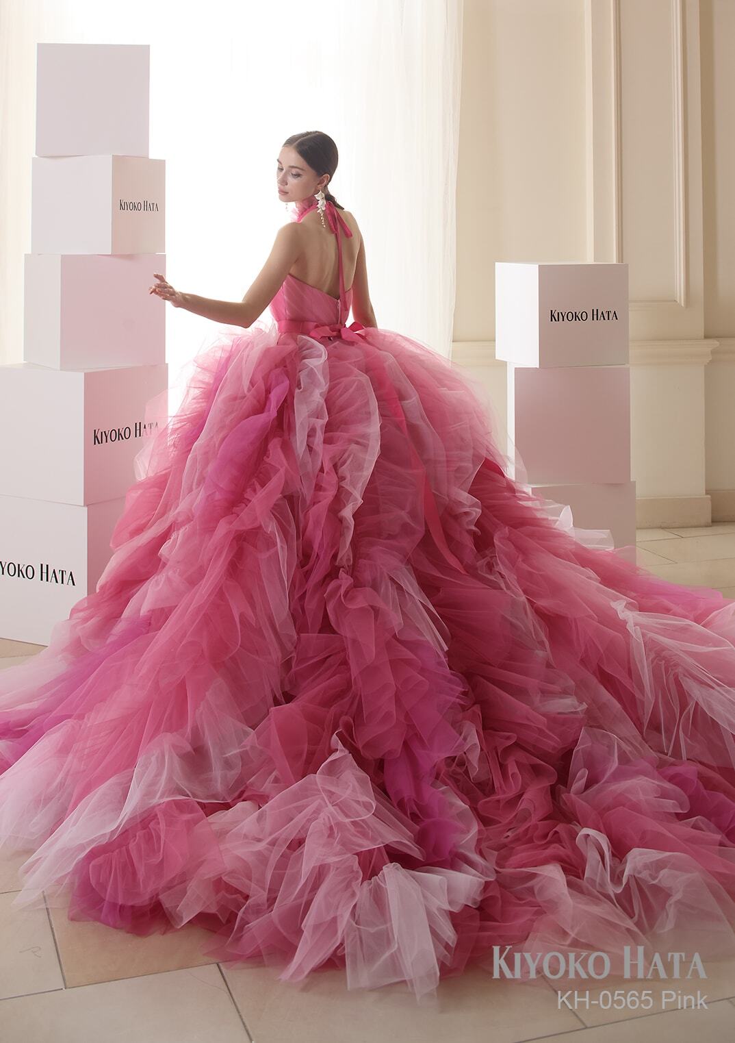 カラードレス ピンク 取り外し襟 サッシュベルト 柔らかく重ねたチュールスカート 華やかなトレーン フレアスカート
