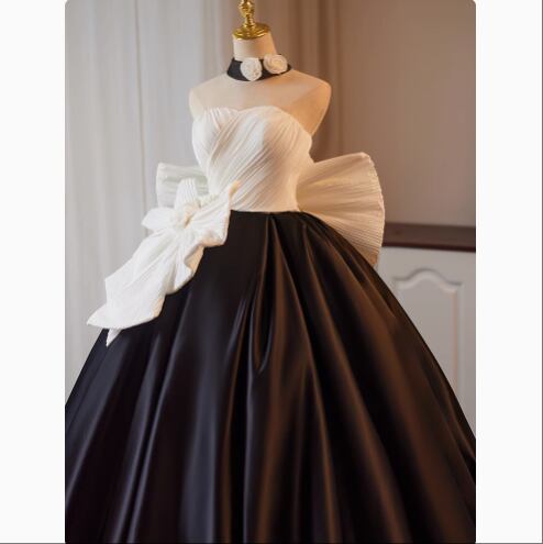 カラードレス ブラック ベアトップ チョーカー 編み上げ 光沢サテン ヘプバーン風 ふっくら柔らかなバックリボン フレアスカート