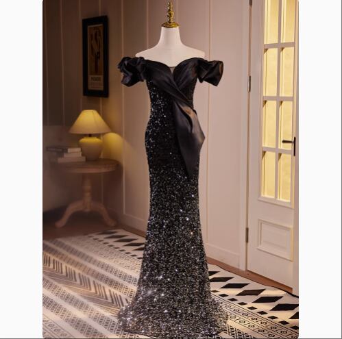 カラードレス ブラック オフショルダー 謝恩会/パーティー 豪華! 編み上げ フランス風 マーメイドライン キラキラドレス