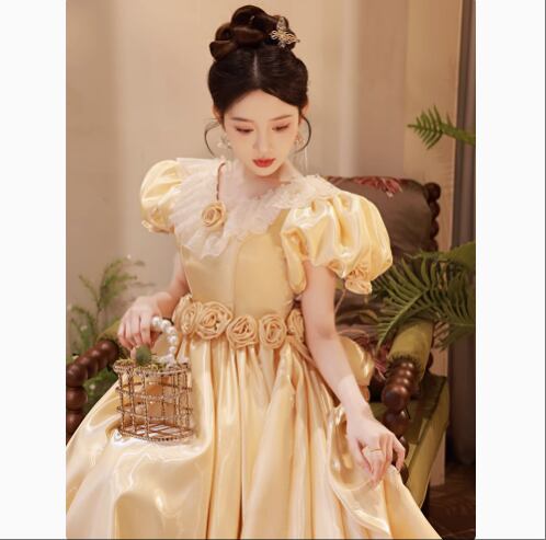 カラードレス シャンパン色 Vネック コサージュ パフスリーブ 光沢サテン プリンセスライン 華やかなトレーン
