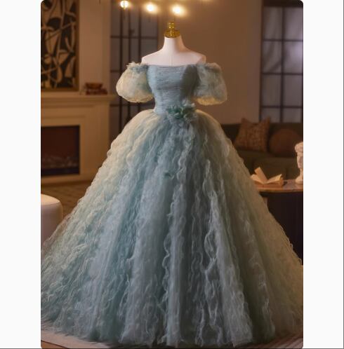 ウエディングドレス グリーン 短袖 チューブトップ 編み上げ プリンセスライン 柔らかく重ねたチュールスカート ロング フレアスカート