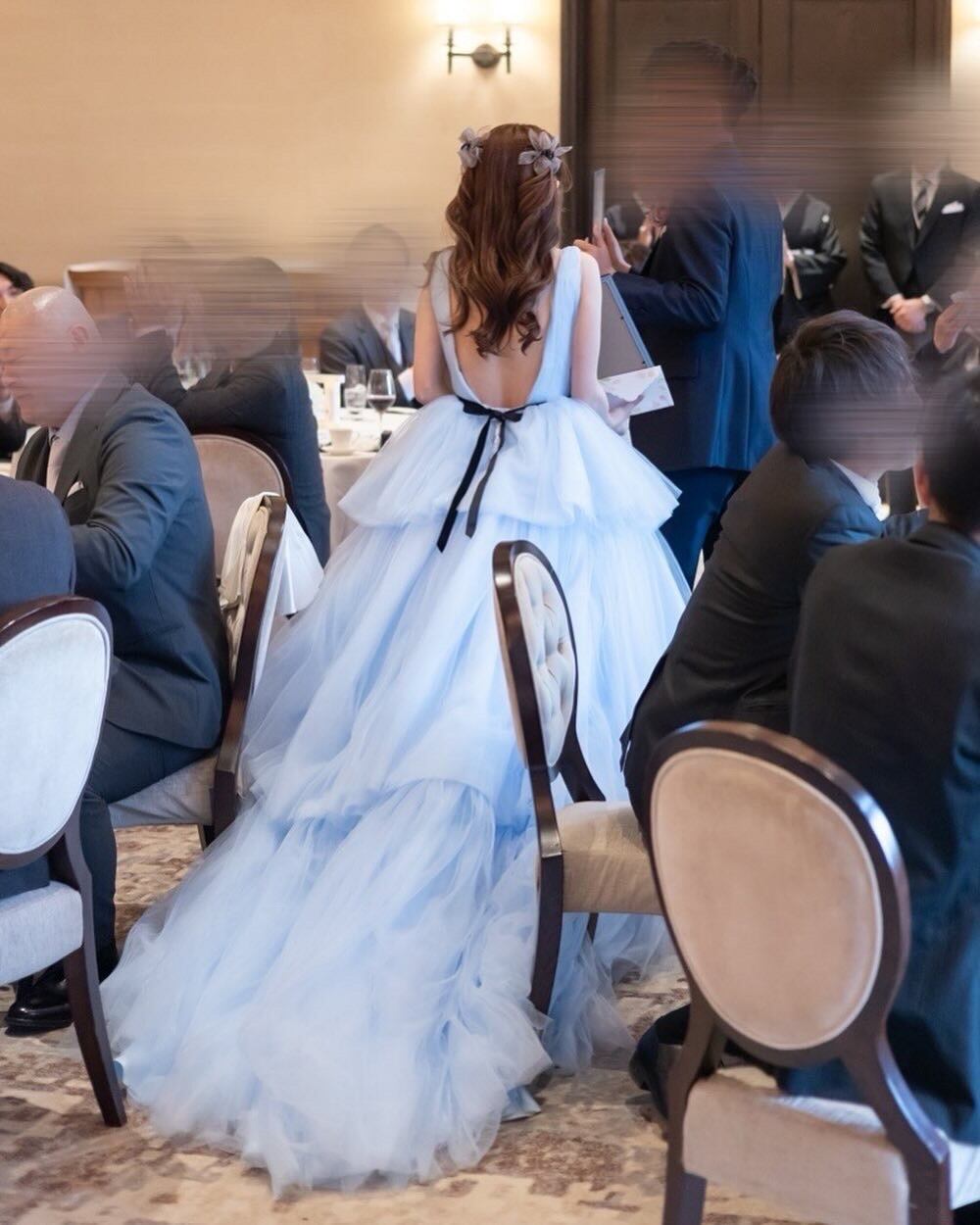 実例写真! カラードレス 爽やかで優しいブルー プリーツドレス Vネックドレス キャミソール ティアードのドレス 可愛い