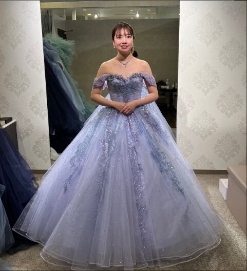 高品質! カラードレス パープル オフショルダー キラキラグリッターチュール 繊細レース 編み上げ 花嫁 ふわふわドレス