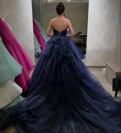 高品質! カラードレス 紫青 ベアトップ ビスチェタイプ 上品レース ソフトチュール 華やかなトレーン アンティークなドレス