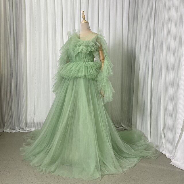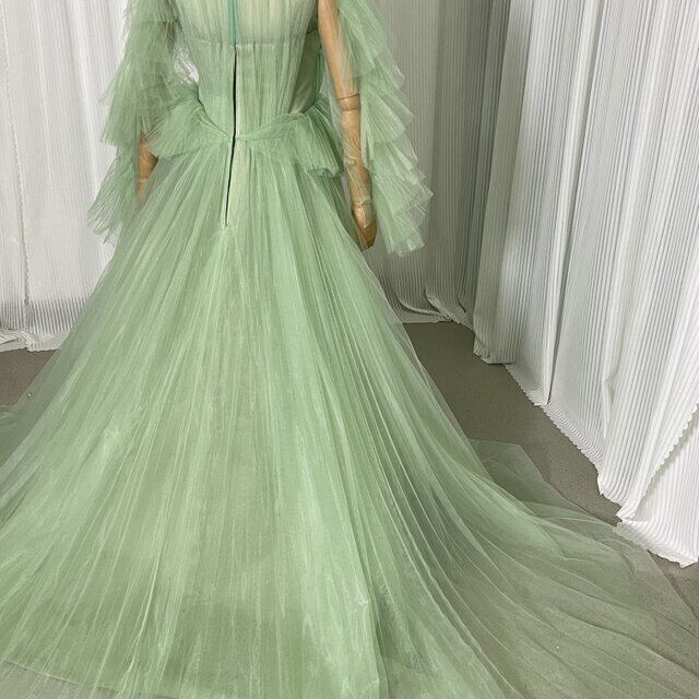 カラードレス ミントグリーンドレス ロングスリーブ ファスナー シワ 花嫁 レイヤードドレス 華やかなトレーン