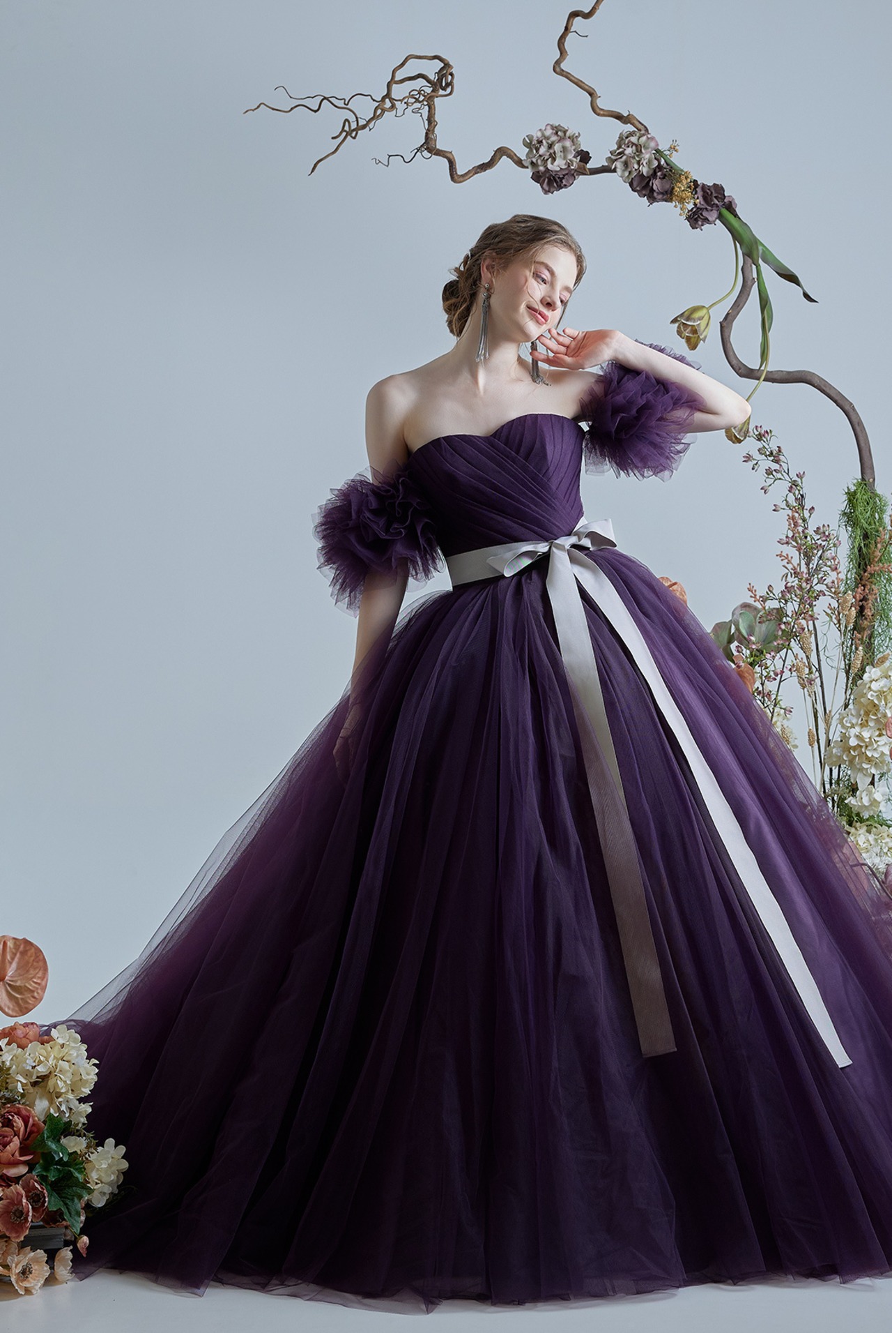 カラードレス パープル ベアトップ 取り外しパフスリーブ サッシュベルト 可愛い 華やかなトレーン チュールスカート