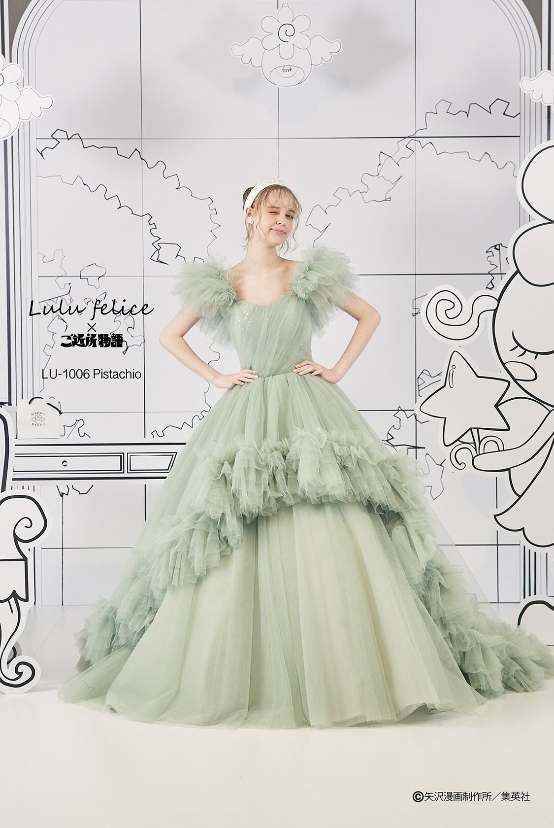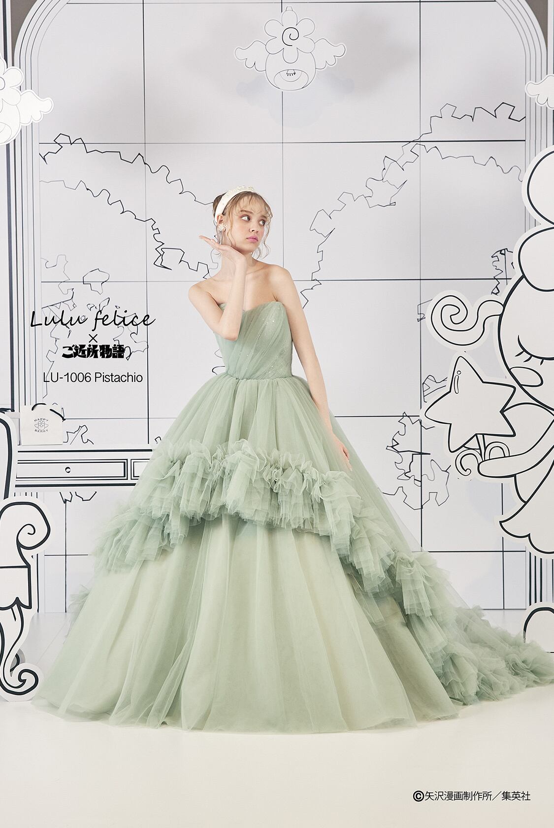 カラードレス ベアトップ 花嫁 フィッシュテール 取り外しオフショルダー 柔らかく重ねたチュールスカート ふわふわドレス ミントグリーンドレス
