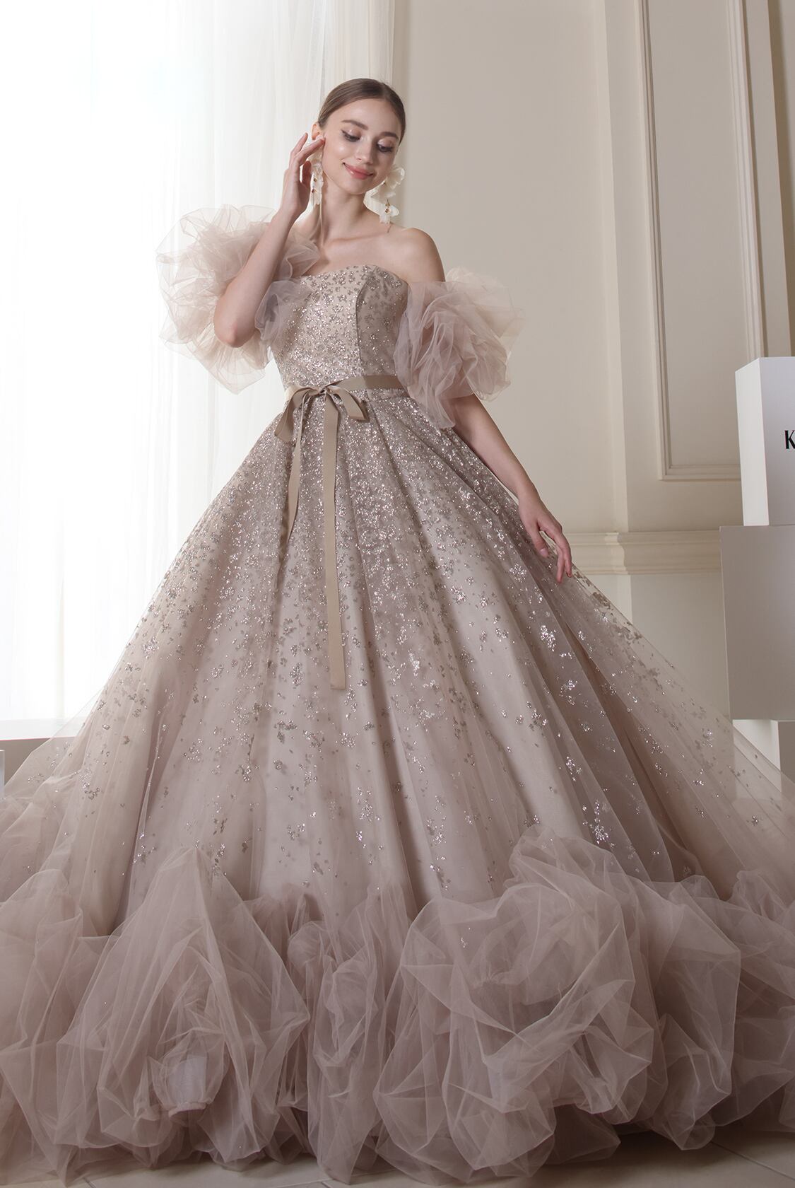 カラードレス 茶 フリル袖 ベアトップ リボントレーン キラキラグリッターチュール サッシュベルト アンティークなドレス