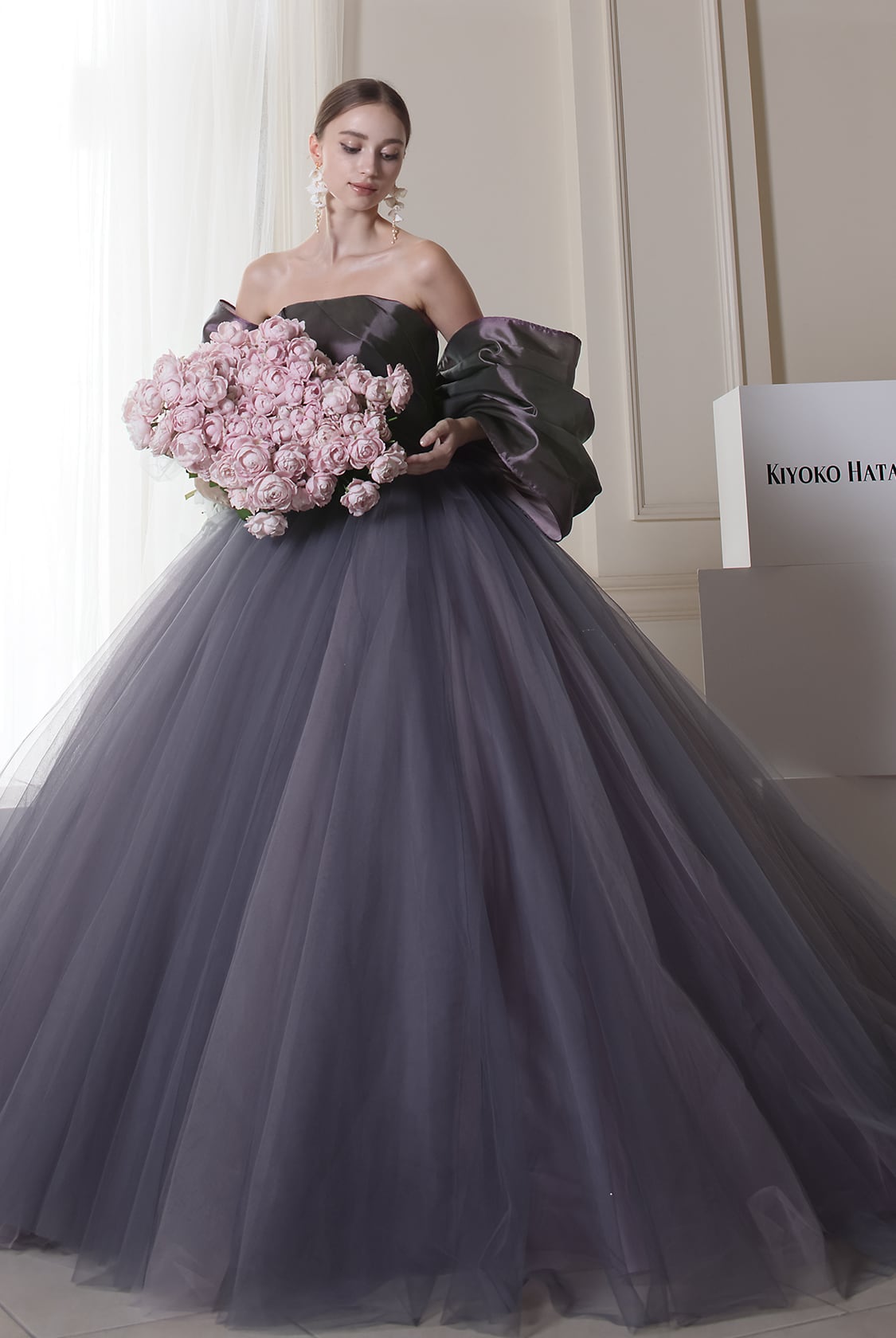 カラードレス パープル 高品質! ベアトップ ソフトチュール ふっくら柔らかなバックリボン 華やかなトレーン 花嫁 ふわふわドレス