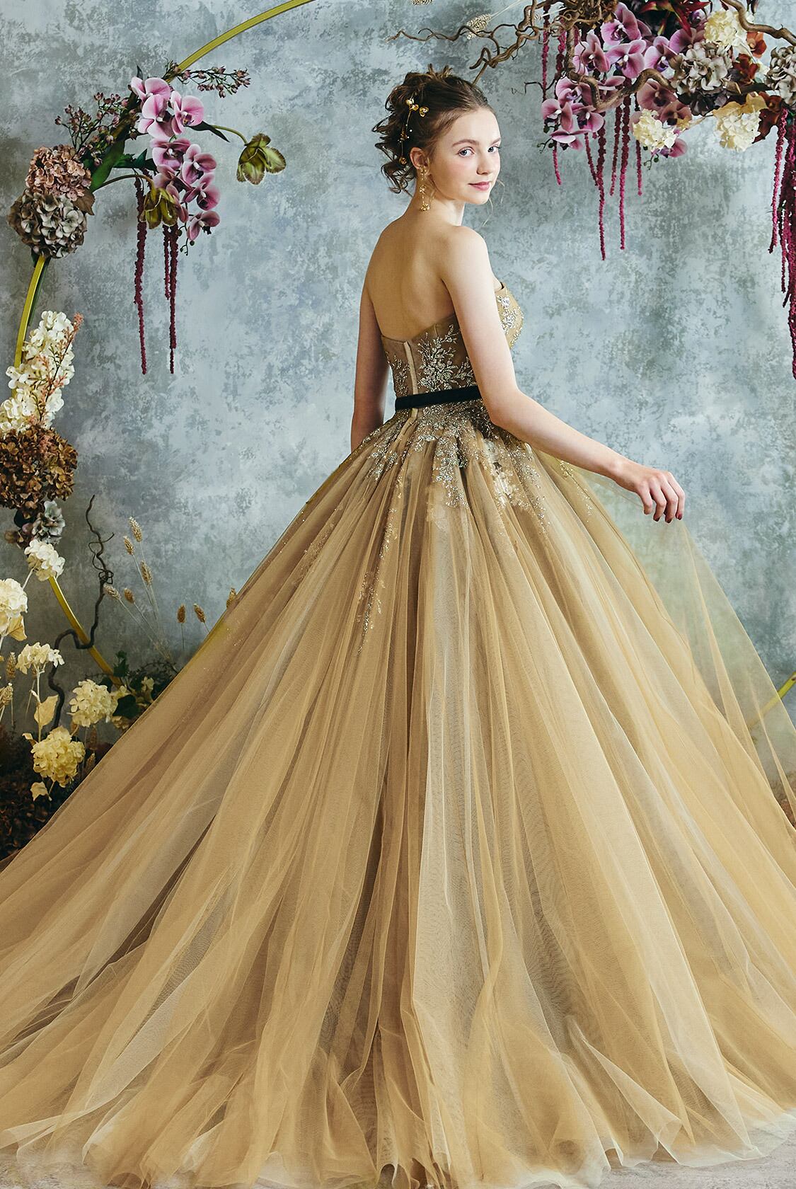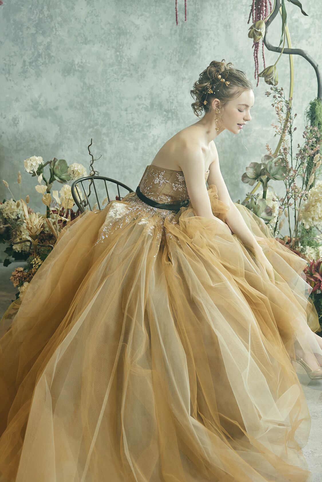 カラードレス イエロー サッシュベルト 上品花レース ソフトチュール ベアトップ 花嫁 トレーン 柔らかく重ねたチュールスカート