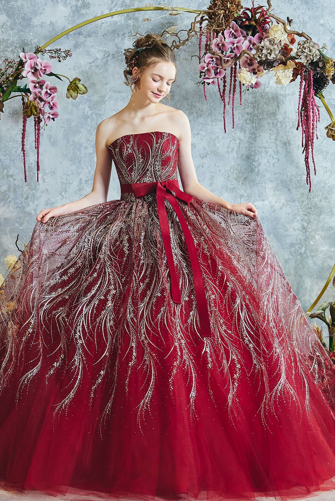 カラードレス 赤 ベアトップ サッシュベルト リーフ刺繍 Aライン ソフトチュール 華やかなトレーン ふわふわドレス