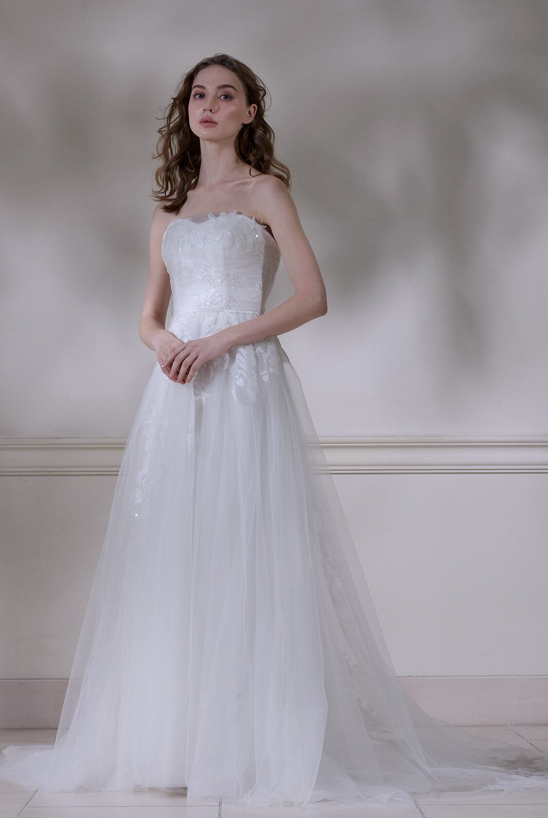 ウエディングドレス ホワイト ベアトップ ファスナー 上品レース ミニトレーン 結婚式 スレンダーライン チュールドレス
