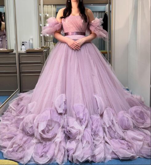 カラードレス ピンク フリル袖 ベアトップ サッシュベルト リボントレーン バラトレーン チュールドレス