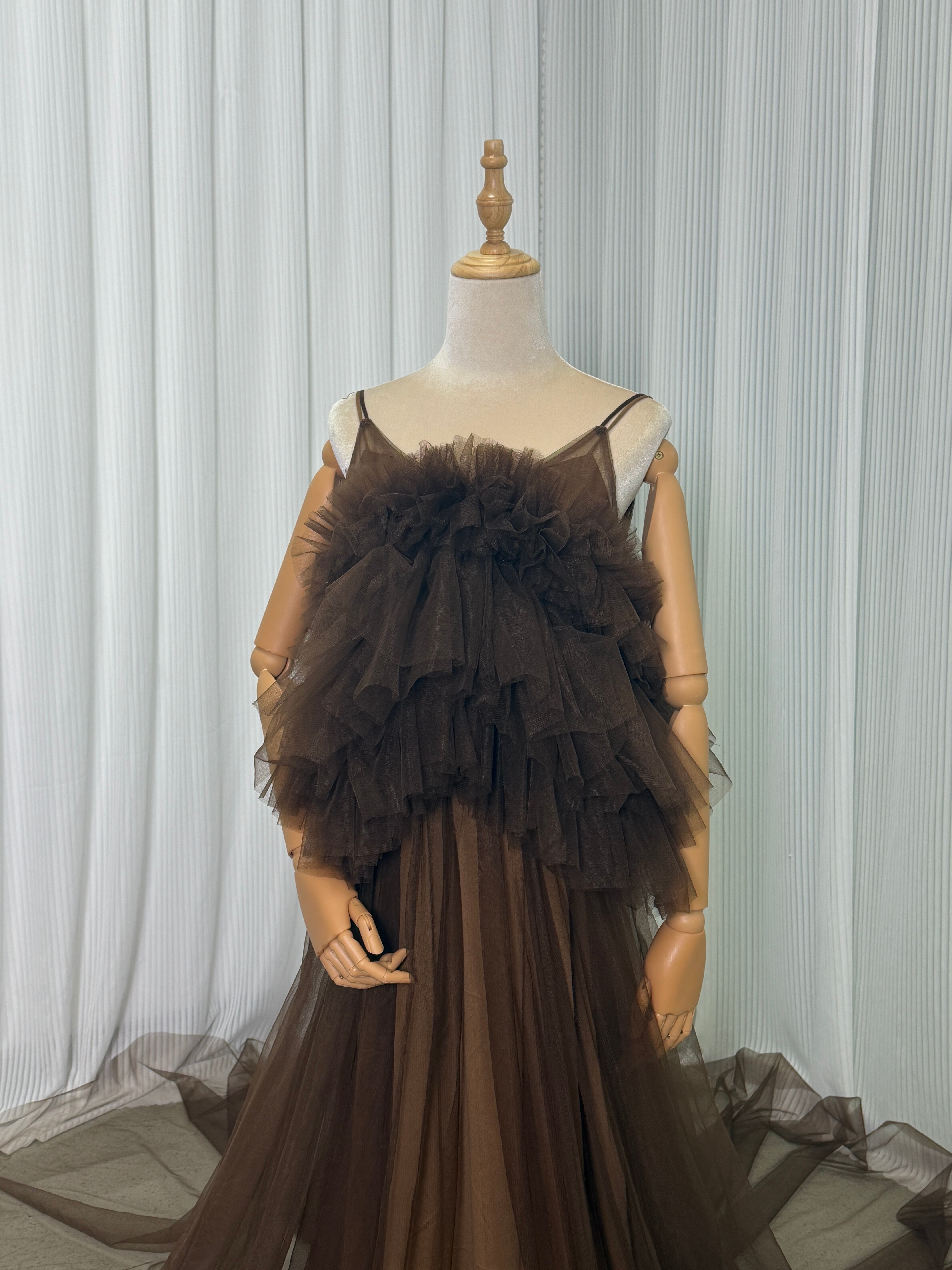 カラードレス コーヒーの色 キャミソール ソフトチュール 揺らめく裾 大きいサイズドレス マタニティ