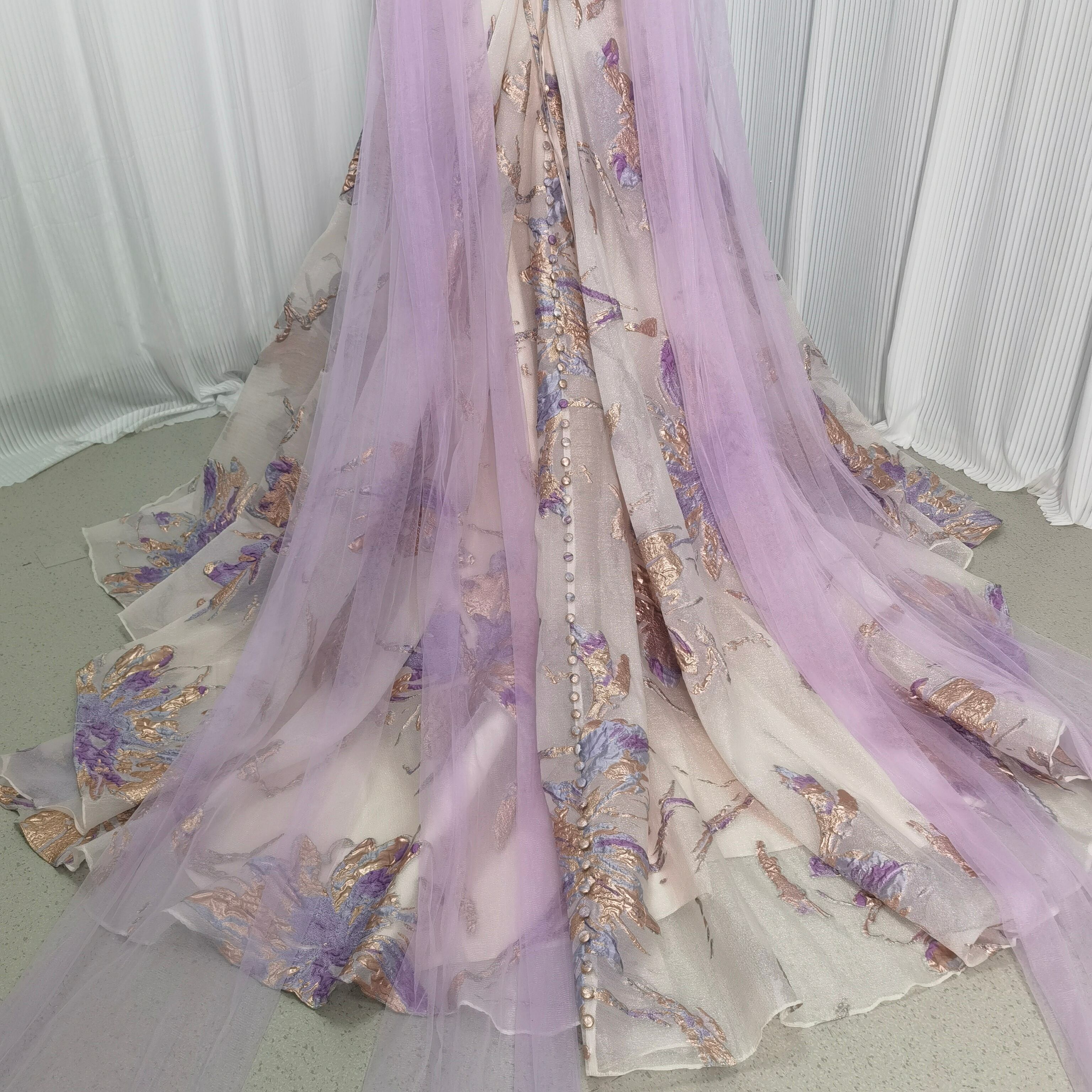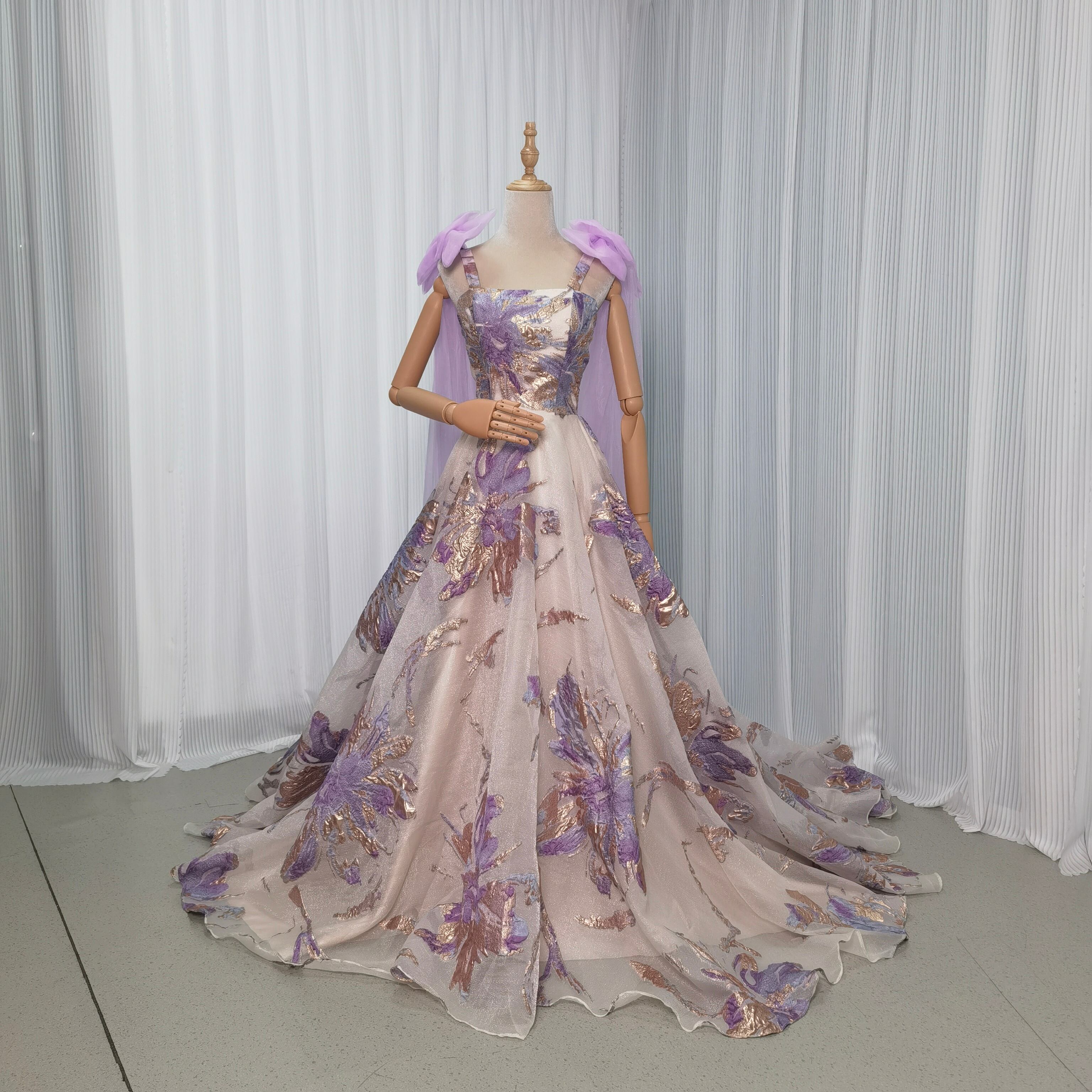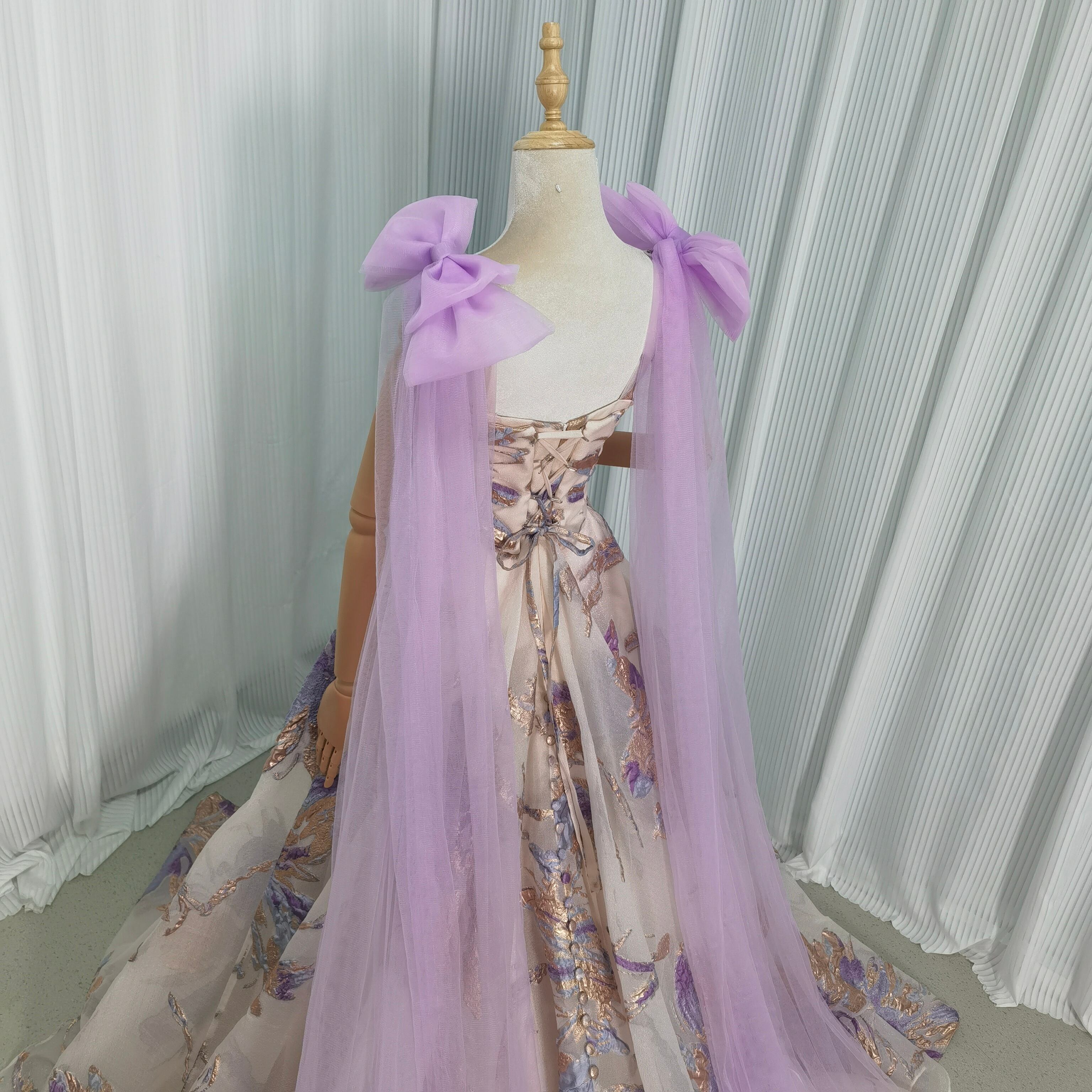 カラードレス パープル ベアトップ 編み上げ リボン オーガンジー 華やかなトレーン プリント模様 目立つ