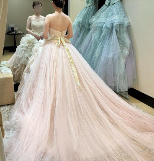 カラードレス 薄ピンク ベアトップ ファスナー サッシュベルト バラトレーン ロングトレーン プリンセスライン