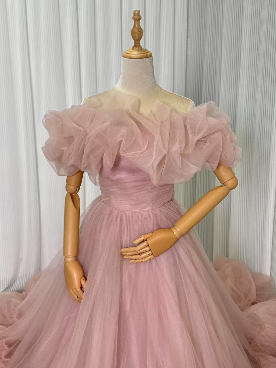 カラードレス ピンク プリンセスライン オフショルダー リボントレーン ビスチェタイプ 細見えシルエット ソフトチュール ビスチェドレス
