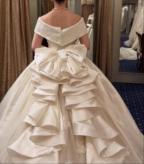 ウエディングドレス オフホワイト オフショルダー ふっくら柔らかなバックリボン 繊細レース グローブ 華やかなトレーン