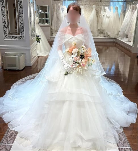 ウエディングドレス ホワイト オフショルダー 編み上げ ベール+グローブ 上品レース 華やかなトレーン 憧れのドレス