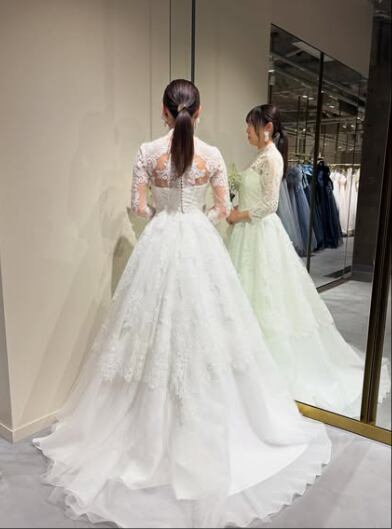 ウエディングドレス オフホワイト ハイネック くるみボタン ロングスリーブ 贅沢な総レース 豪華! 結婚式 憧れのドレス