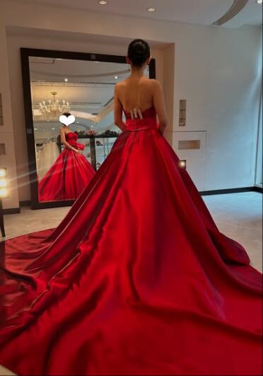 カラードレス 赤 ベアトップ 取り外しリボン 光沢サテン 華やかなトレーン クラシカル 音楽会/発表会など /前撮り アンティークなドレス