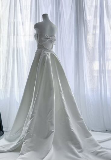 ウエディングドレス ホワイト ベアトップ 背中見せ ふっくら柔らかなバックリボン 光沢サテン ロングトレーン 前撮り 憧れのドレス