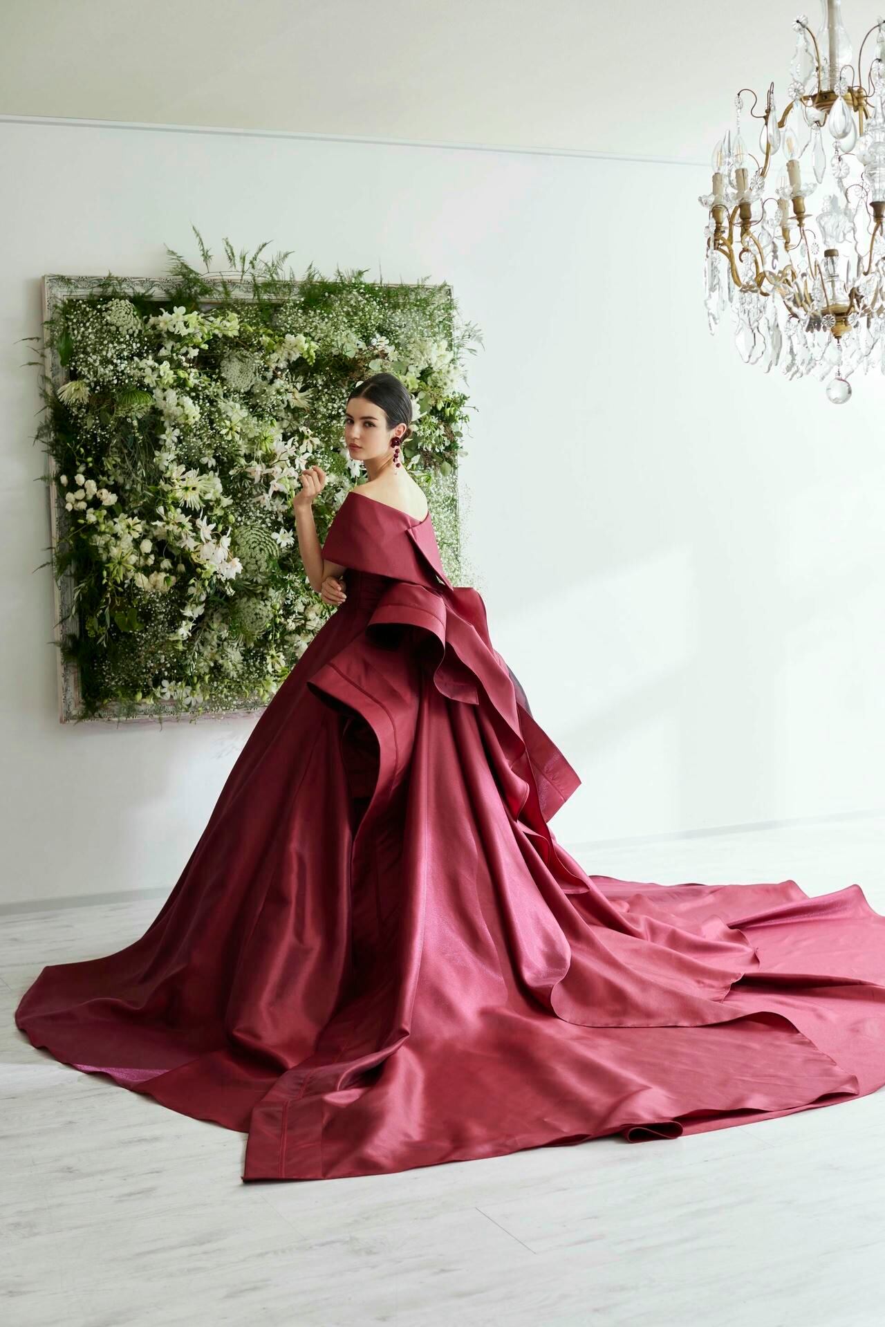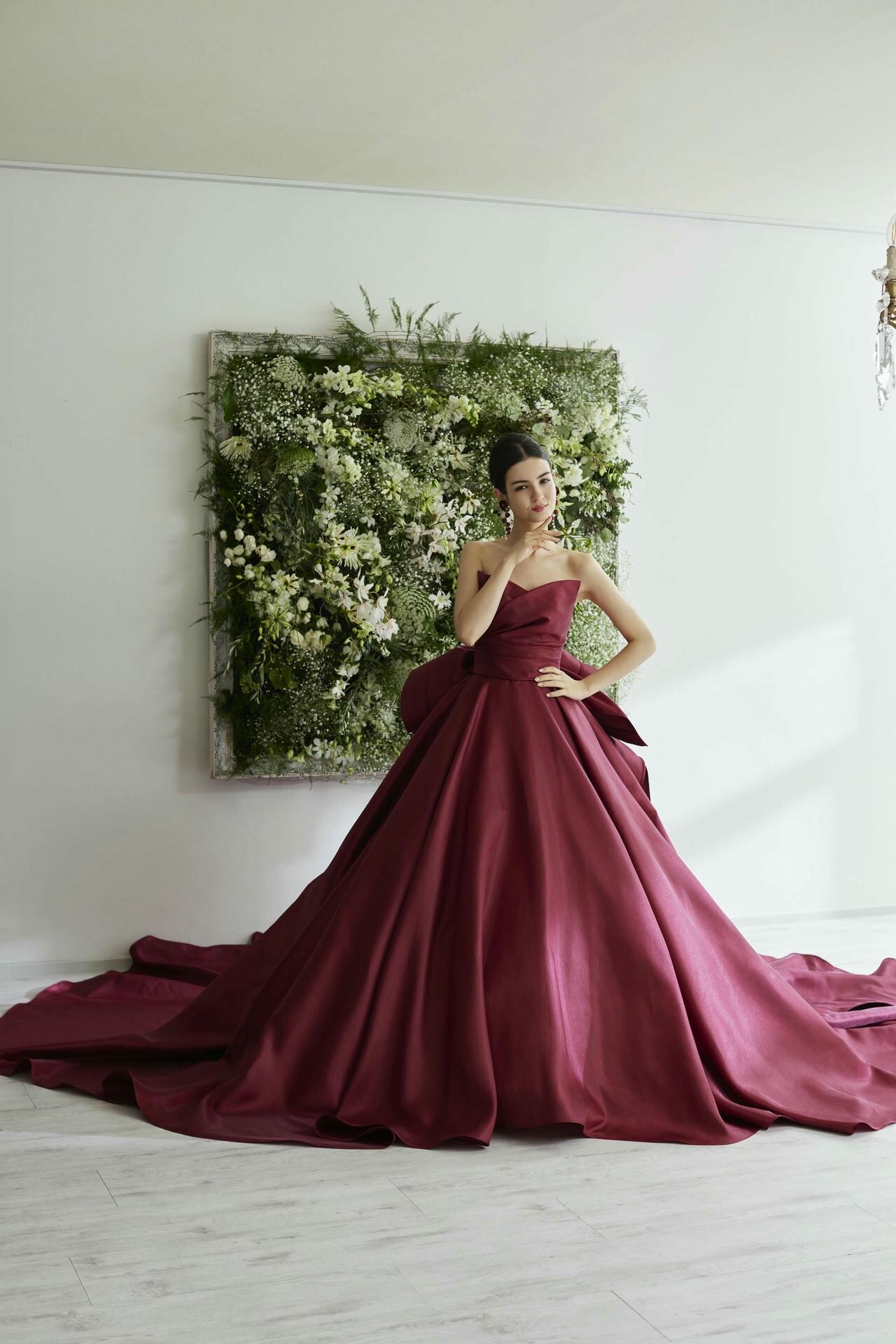 カラードレス ワインレッド 取り外しオフショルダー 高品質! 光沢サテン 華やかなトレーン 花嫁 細見えシルエット ふわふわドレス