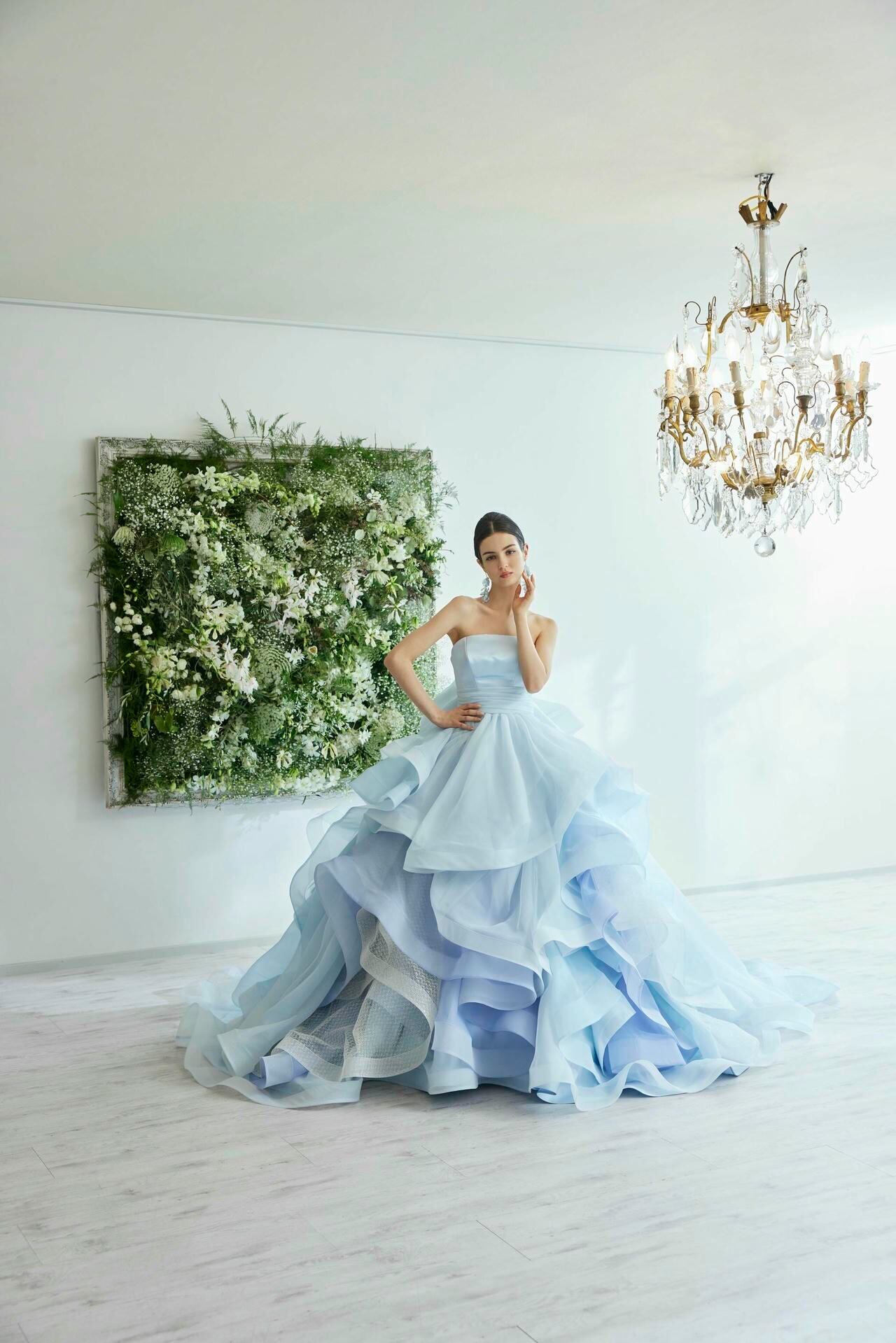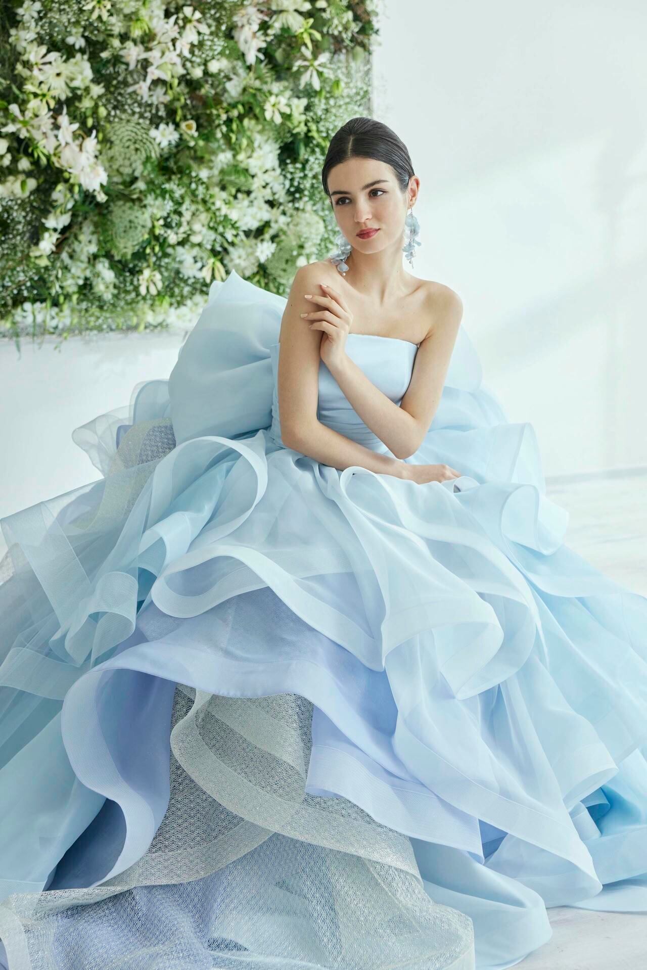カラードレス 爽やかで優しいブルー ベアトップ 背中見せ 柔らかく重ねたチュールスカート ロングトレーン 花嫁 ふわふわドレス