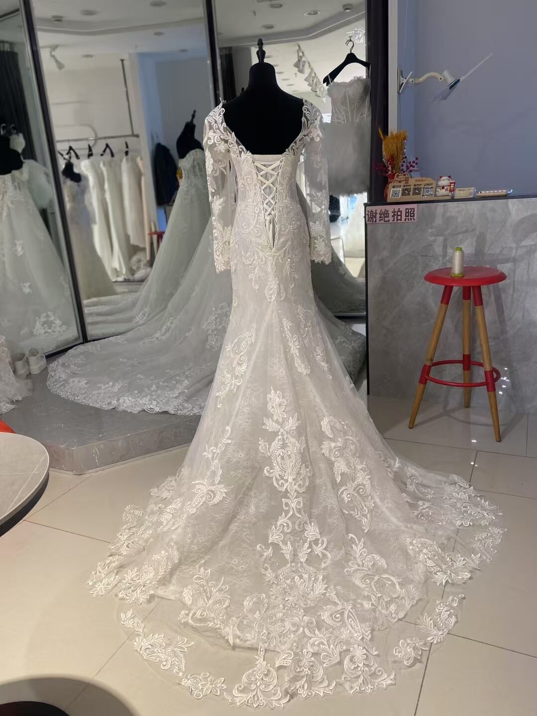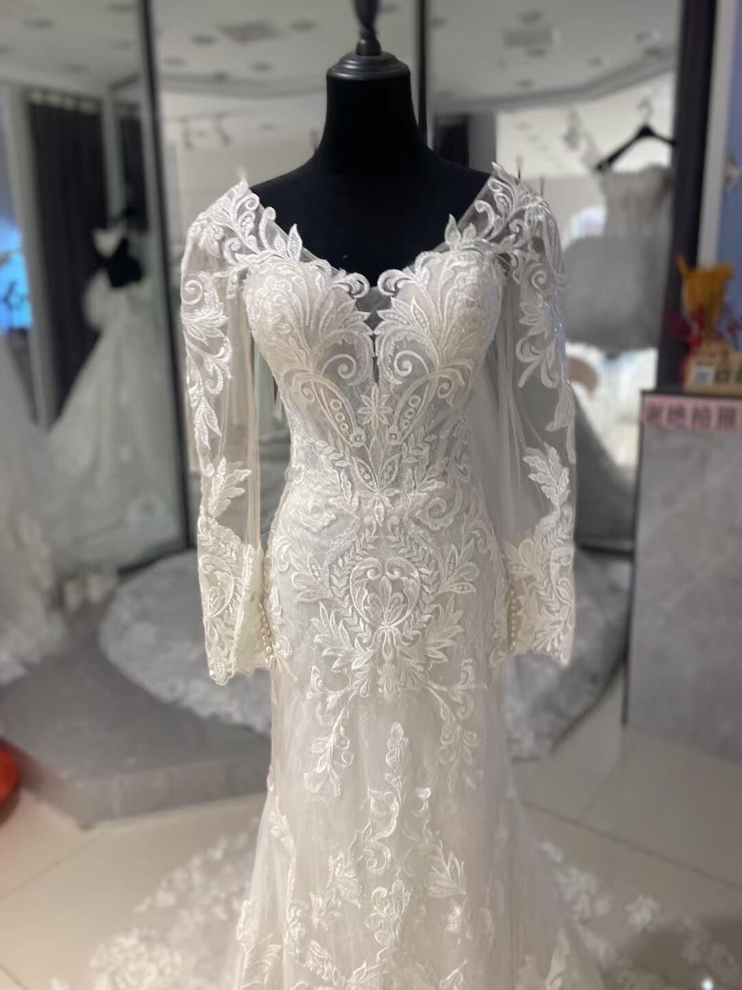 ウエディングドレス オフホワイト ロングスリーブ Vネック 編み上げ 贅沢な総レース ミニトレーン 結婚式 前撮り
