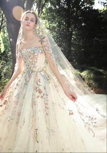 ウエディングドレス オフホワイト ベアトップ フレア袖 ロングベール 花柄のモチーフ刺繍が美しく 華やかなトレーン 前撮り