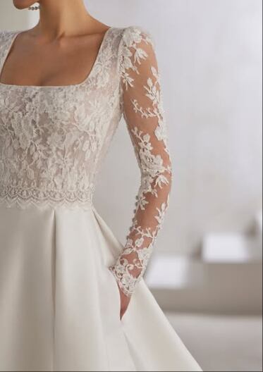 ウエディングドレス オフホワイト スクエアネック バックレス フェミニンなフレームレースの袖トップス 光沢サテン 華やかなトレーン