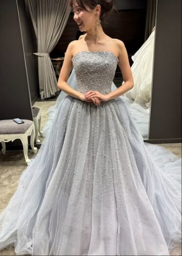 カラードレス グレー ベアトップ くるみボタン ソフトチュール 華やかなトレーン 花嫁 前撮り キラキラドレス